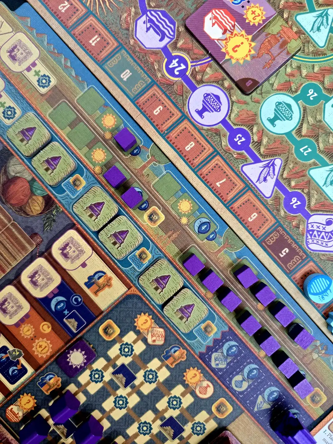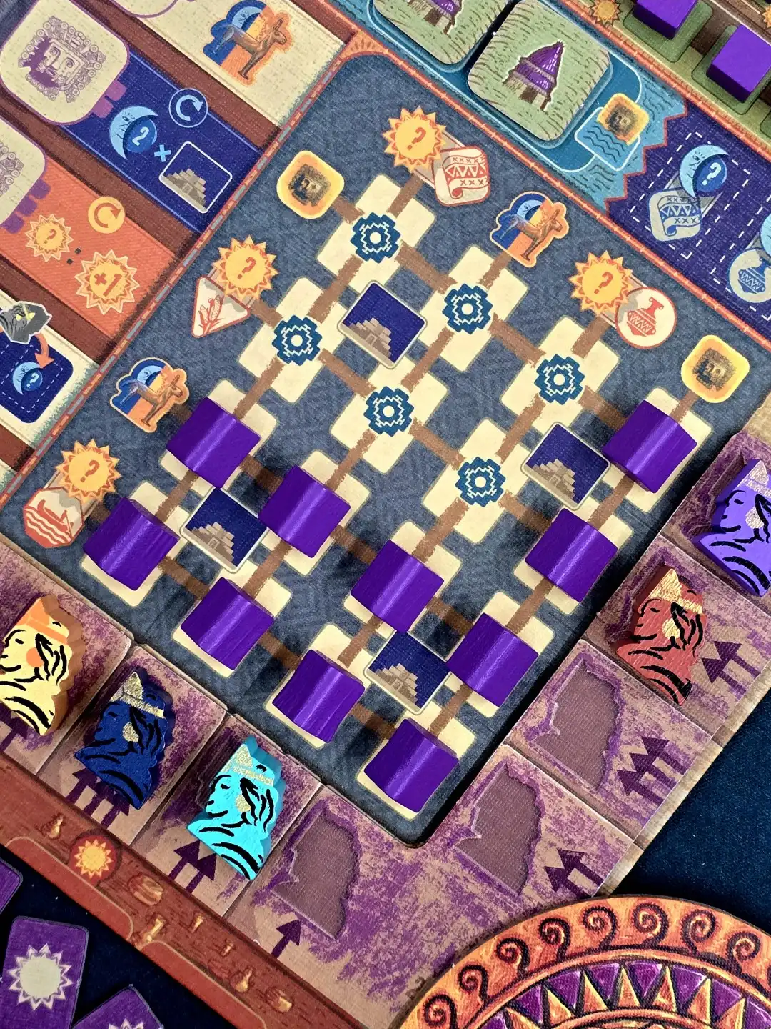 What’s interesting is how the strength of an action is determined by the amount of houses missing from the row/column of your Step marker. There are also different ways of increasing your Sun and Moon scoring for each of these actions. It’s all quite abstract and takes time to really digest how it’s all tied together.