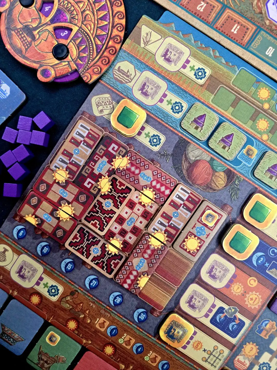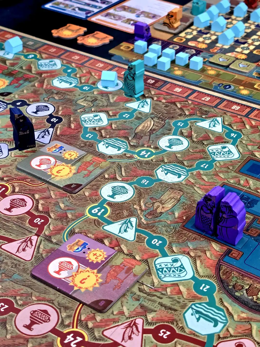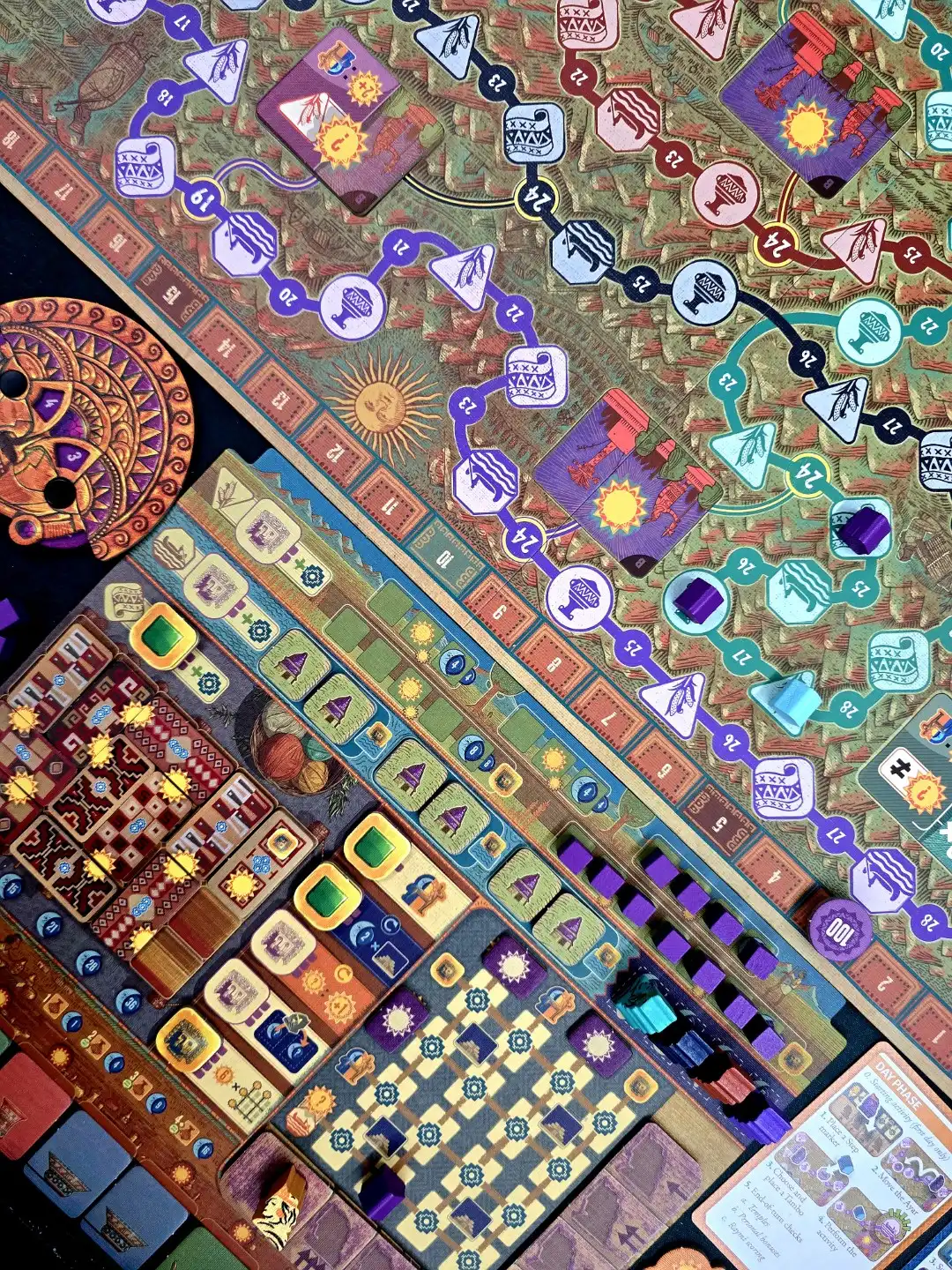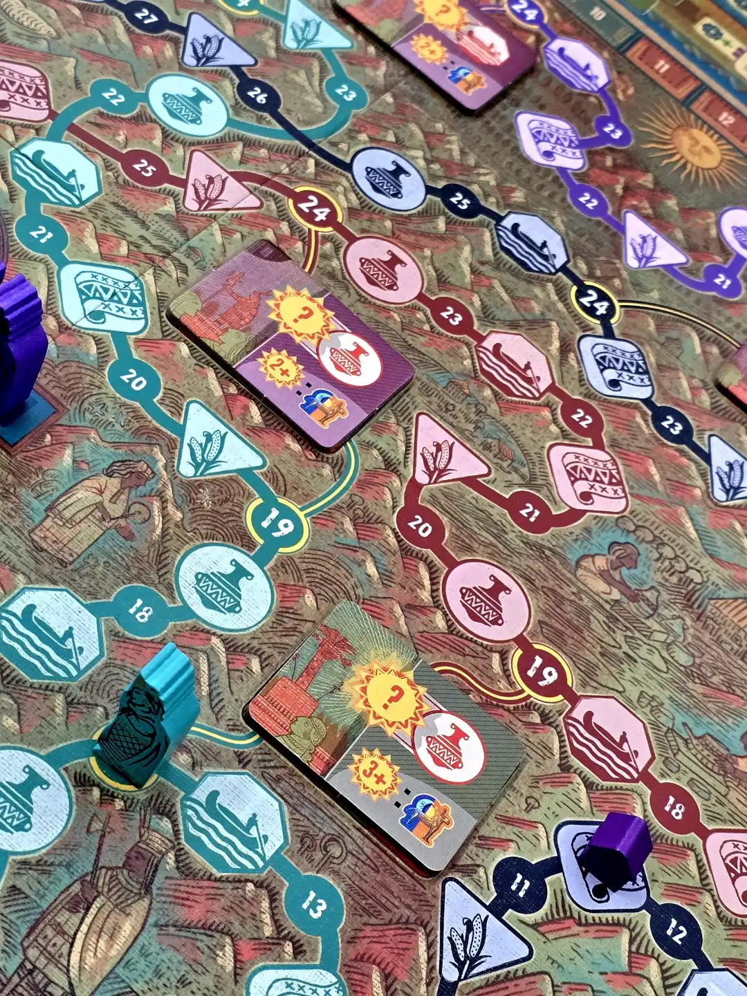 Ayars will trigger scorings as they progress on their tracks, and the slowest Ayar will retire at the end of each round. You really have to keep an eye on what scorings are available, what is coming up and when. Good timing is quintessential. There will be different opportunities to score Sun and Moon points and both are important, as at the end only your lowest of the two will count! 😦