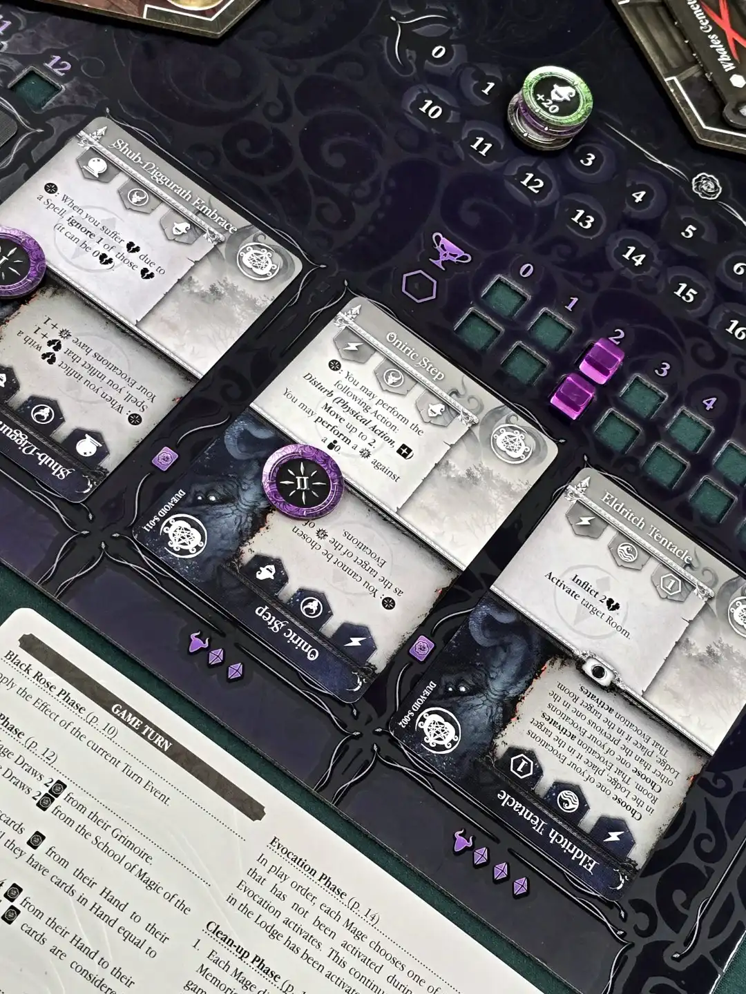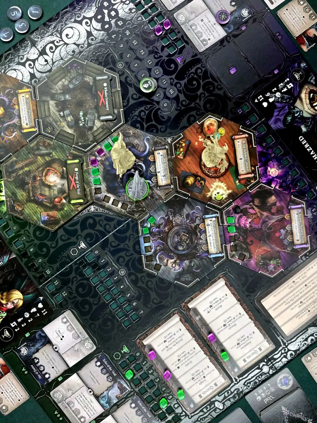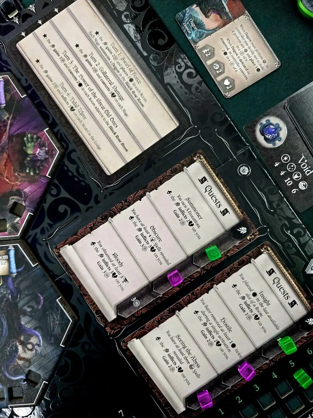 🛡️The other part is area control, as with spells you cast and things you do you fill up slots of the rooms with instability cubes. If they’re filled they flip to a stronger side, and you also hand out points according to majority.