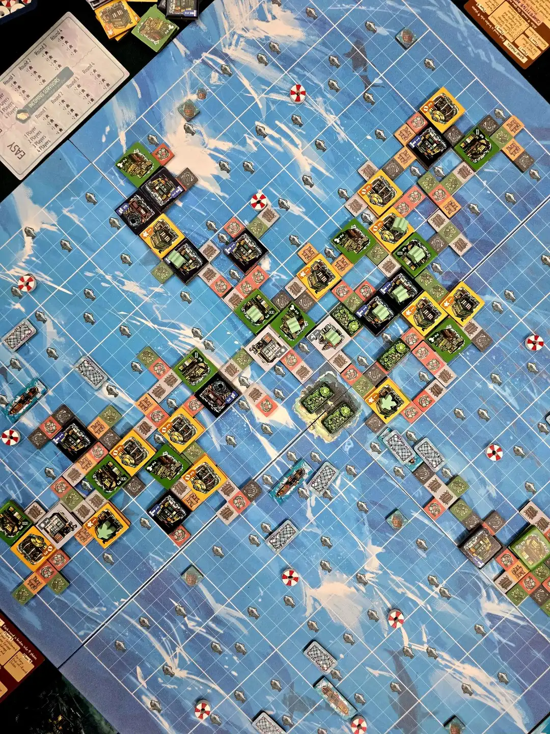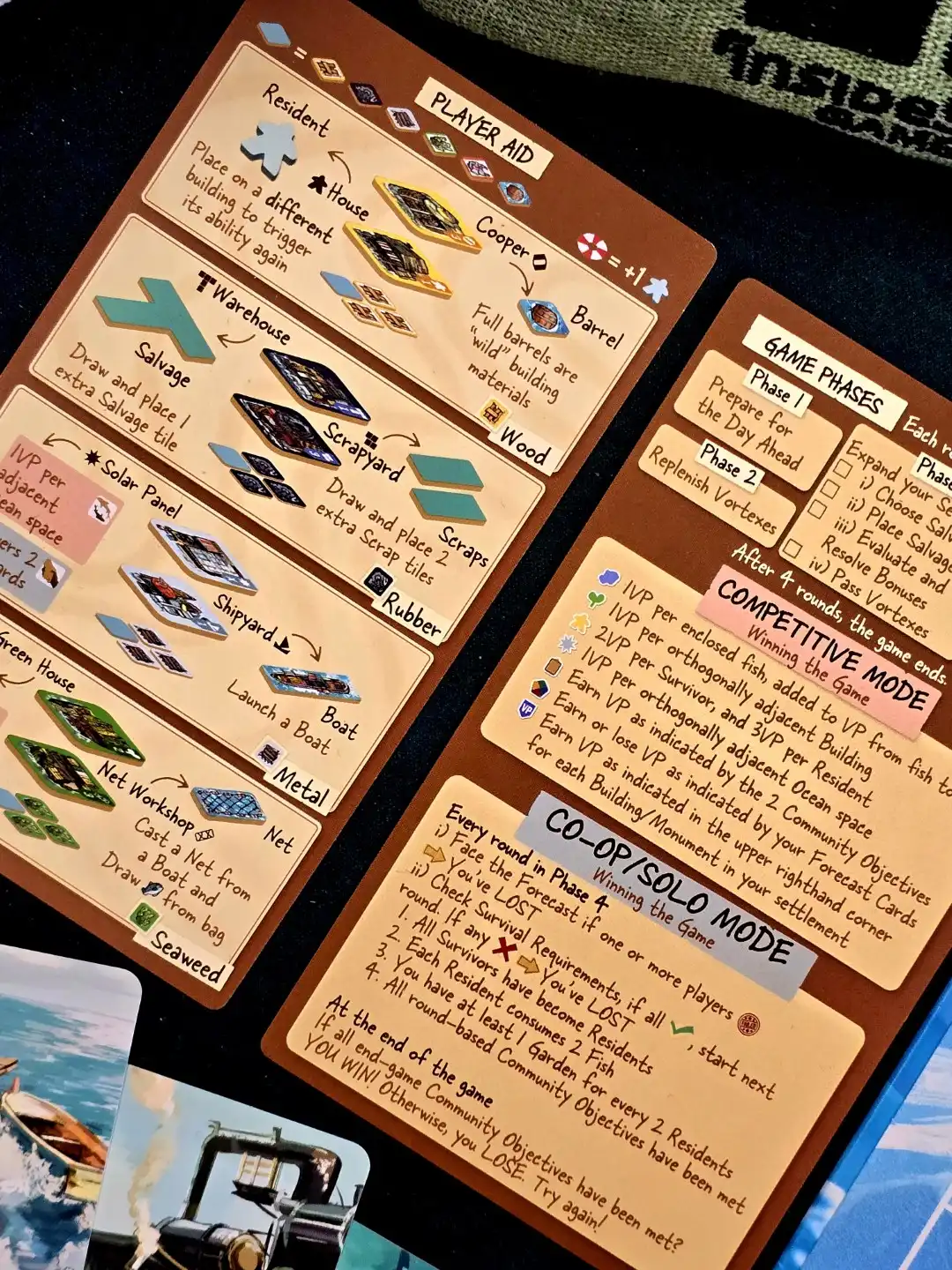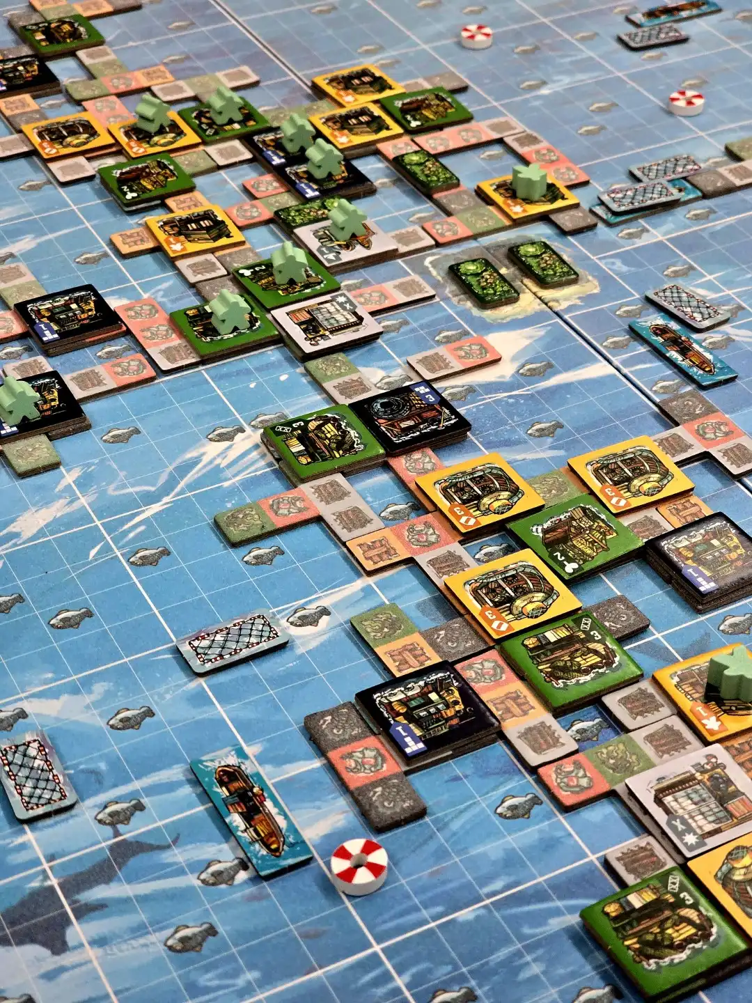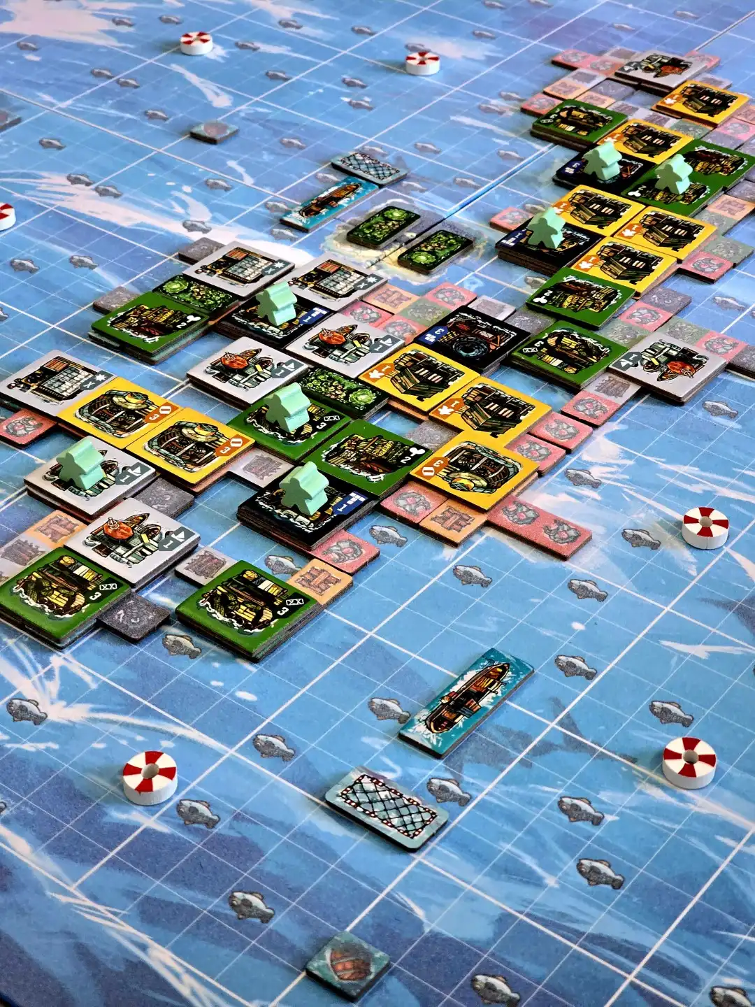 Some survivors also arrive each round, raising the population. At the end of the round you have to be able to feed them all by having enough fish π (which you also have to spend down), and having enough gardens π± (which is just a threshold). Each survivor also has to be allocated to a building so they have shelter. Thatβs not easy to do when you only get 4 tiles each to place in a round! π΅