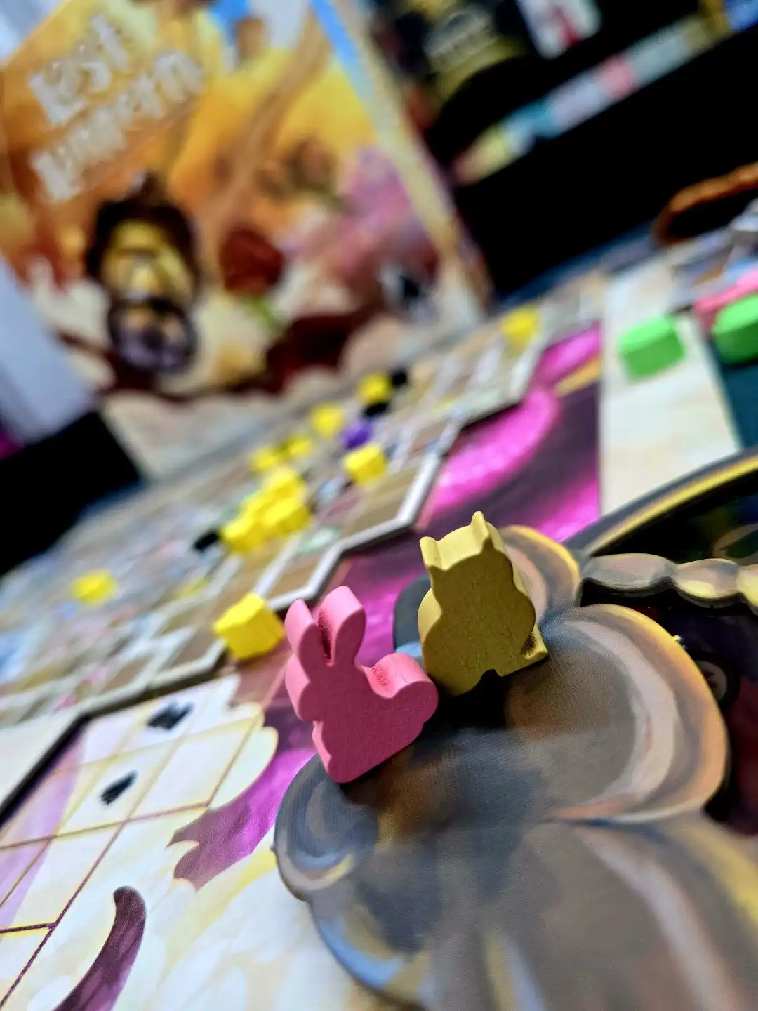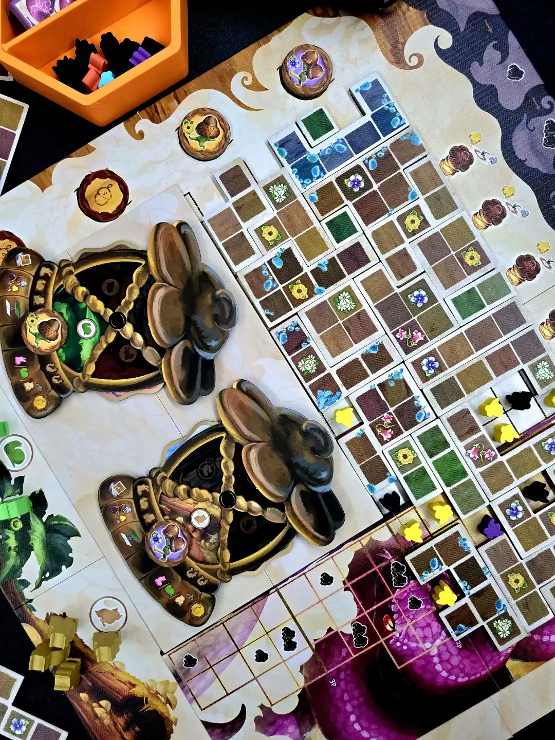The biggest novelty of the game is a bit of a no-communication 🗣️ twist: Each round players use their lantern wheels to secretly choose a pair of things (a polyomino tile and a familiar meeple) to use. If you pick the same pair, you have to divide them between you, which is really suboptimal. (To be fair you can talk before and after this drafting phase, so you can discuss what you need to game the system a bit - but accidents often happen 😄).