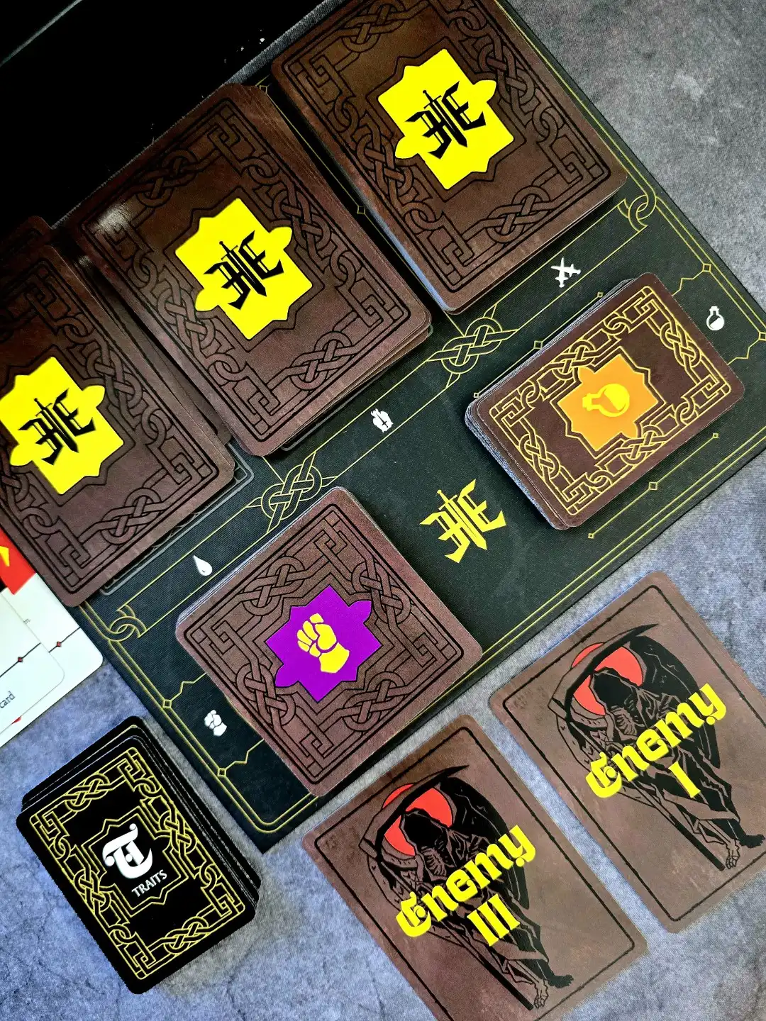 The game uses deck-building and a unique, well-flowing card-connecting combo system that is really entertaining. 🙃 Each round your current enemy acts according to a track and icons on the enemy card itself - which is mostly about adding threat dice or taking wound cards - then players get to act, simultaneously playing their cards as they best see fit. ⚔️