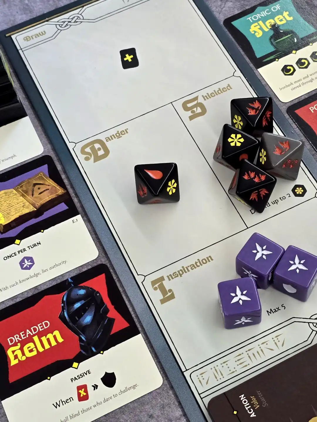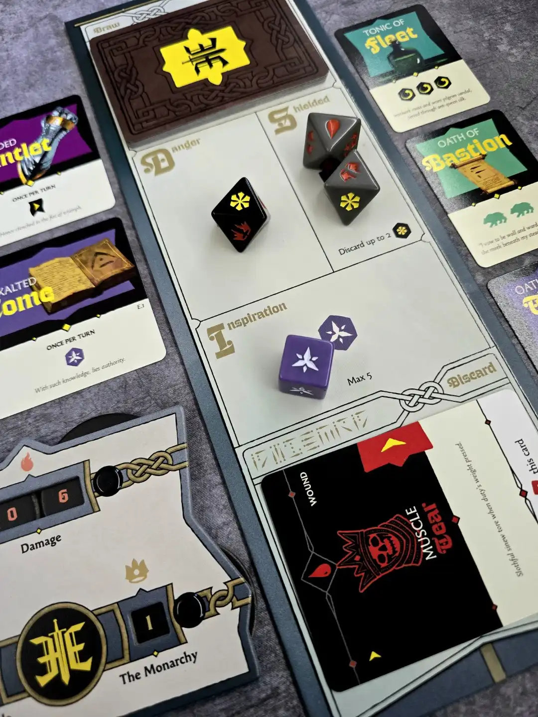 There are a bunch of possible effects on cards: damage 💥 to decrease the life of the enemy, shields 🛡️ to “defuse” threat dice that you got from the threat pool, additional card draw 🃏, Temple ✝️ or Monarchy ⚜️ symbols to earn resources you can exchange for bonuses and new cards for your deck, or you could get Inspiration dice 🎲 that can help you out in a pinch.