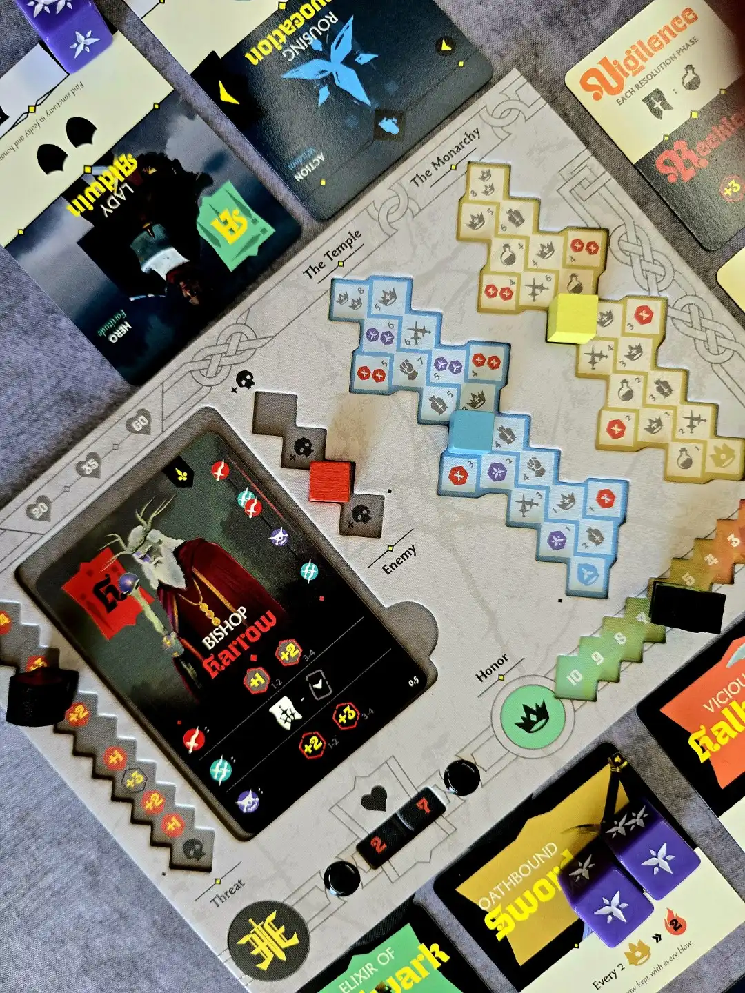 Undefended threat dice can either give you wound 🩸 cards that clog up your deck, or decrease the Honor 👑 track. Take too long, run out of Honor or deplete the supply of wound cards and you lose! ☠️ Successfully defeat the 3rd enemy and you win! 🏆