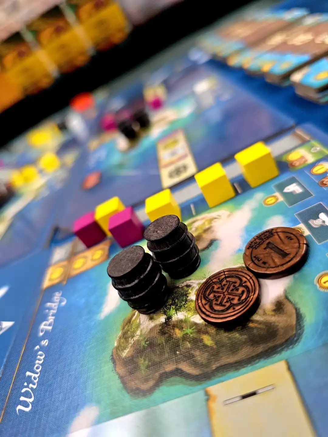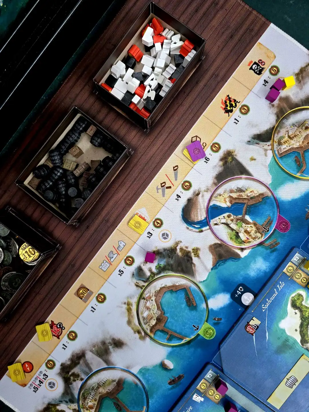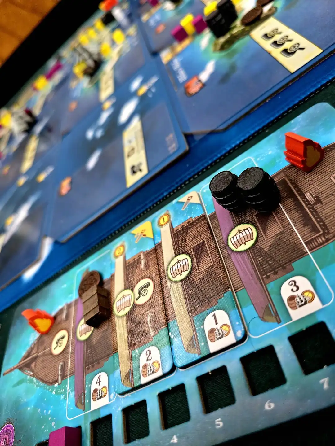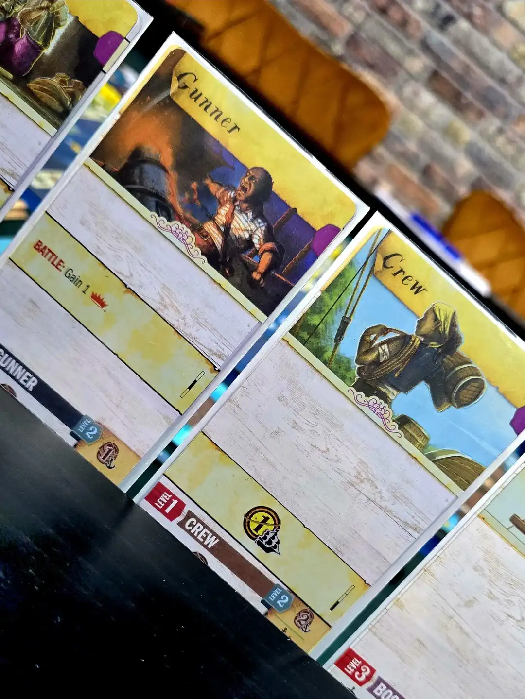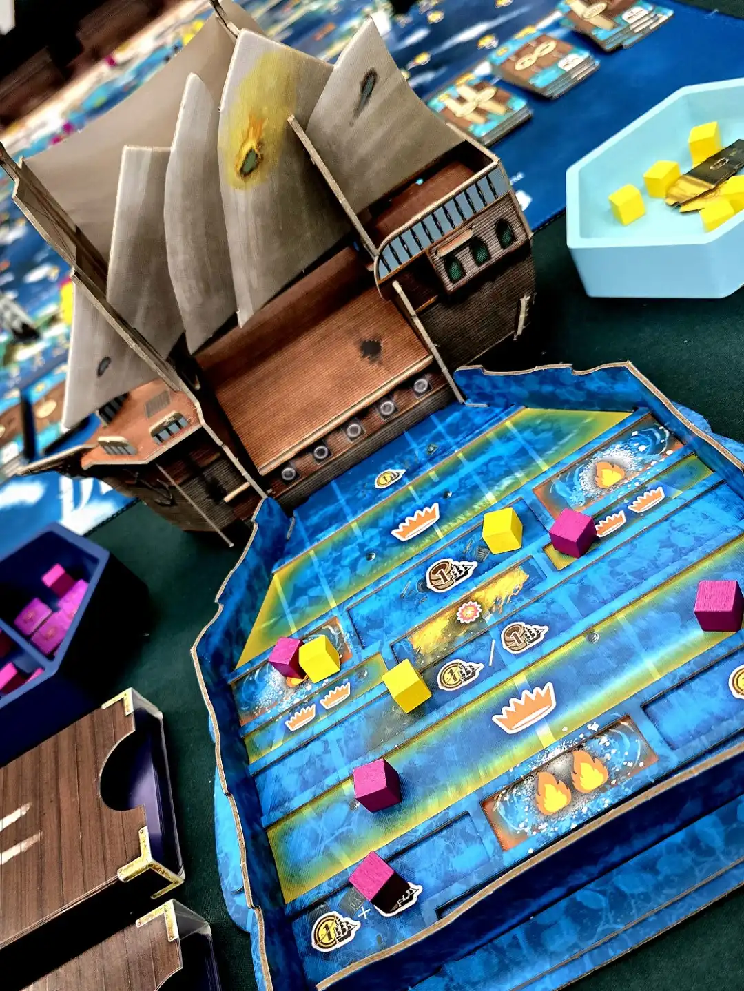 And of course with a pirate game, some ship battles and cannon fire cannot be absent: ⚔️ This infuses a bit of ameri into the otherwise euro game mechanisms. Luckily it's not dice rolls, instead you get a cube tower, which is a cool cardboard ship. ⛵ During battle you calculate how many cannon icons players have, and throw in both attacker and defender cubes, and evaluate their effects depending on where they land. You can earn crowns to win the battle, do damage to the opposing ship, or plunder cargo and gold. It's quick, it's punchy, it fits the theme and is quite random 🤭.