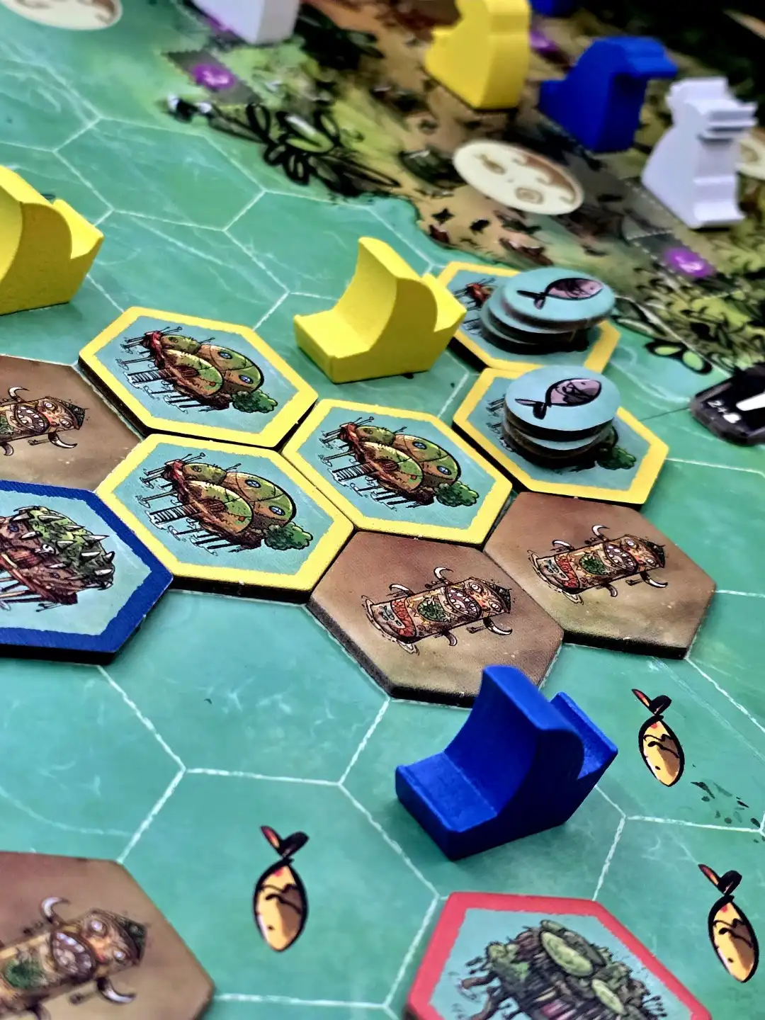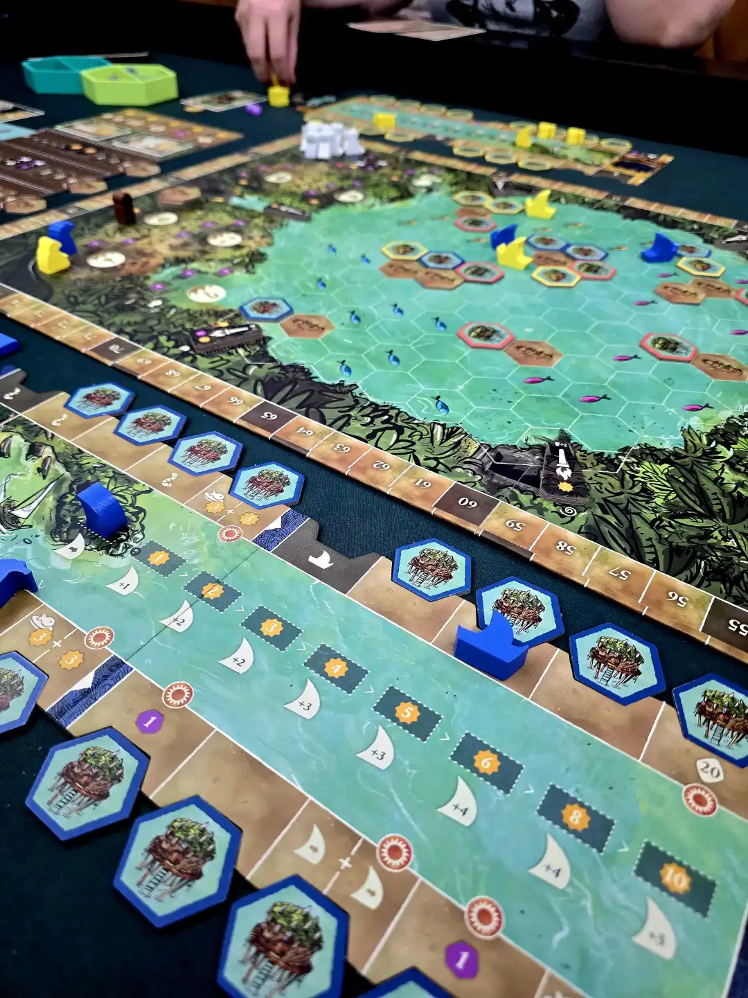 The core of it all is worker placement, with some actions also requiring positioning of your boats on the map. 🧐 This boat movement is actually the central puzzle of the game, because as players place down settlement hexes to expand the starting islands, possible routes get more and more restricted (two separate islands can never merge by any placement, so you will end up with a bunch of thin canals to sail through).
