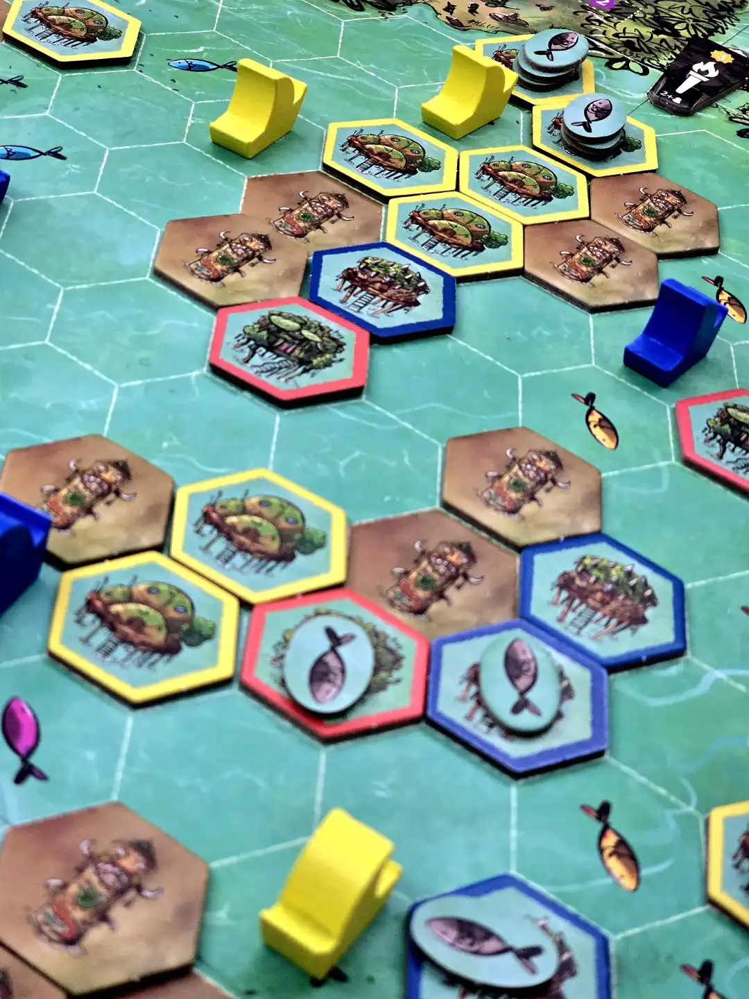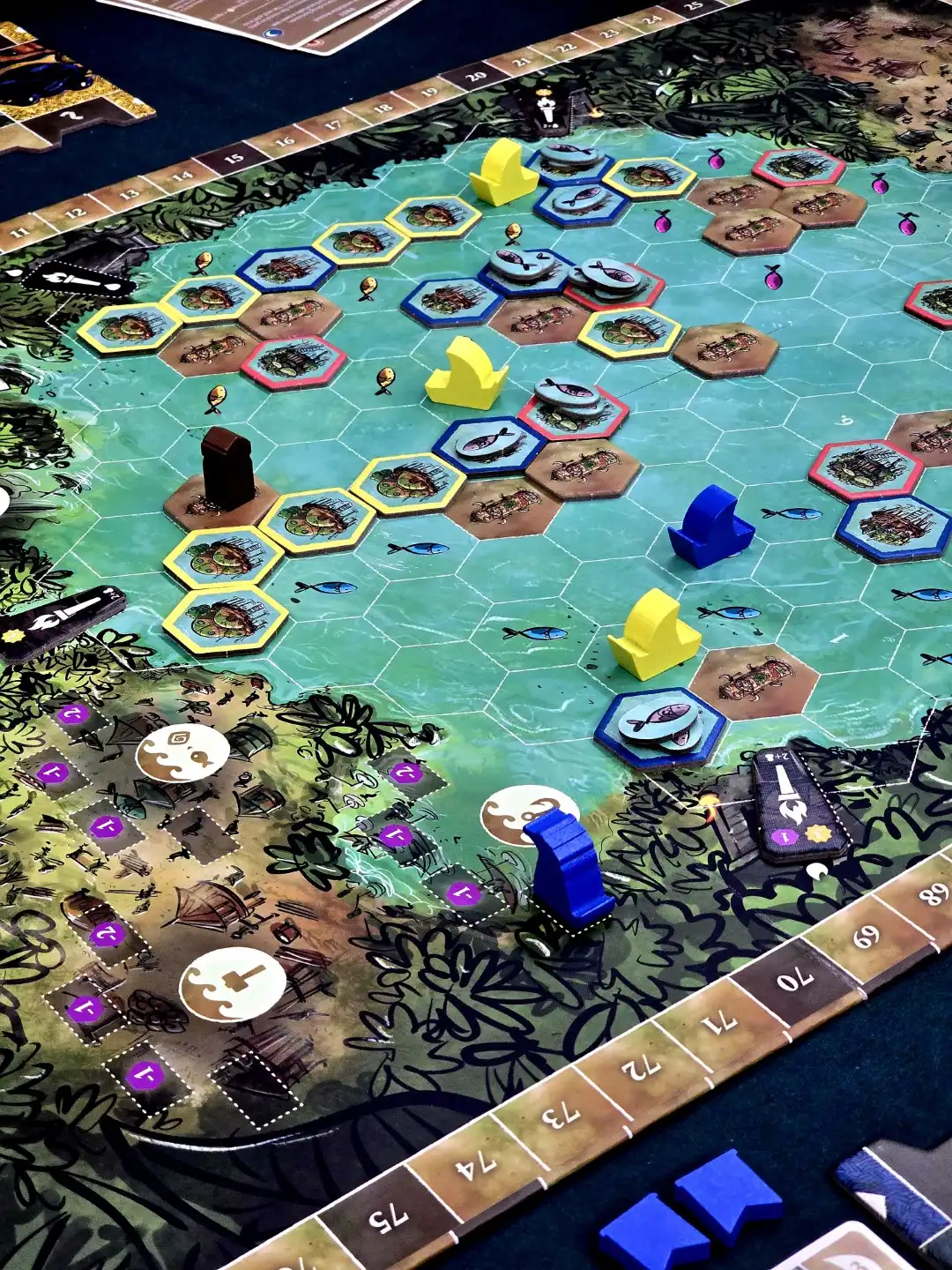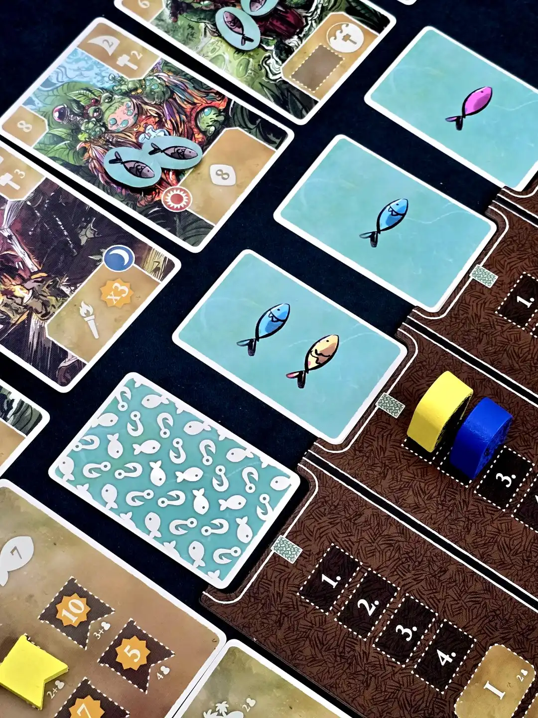 Gameplay is interactive. The islands grow and change shapes as you play, and each round different fish are “in season” which makes you move around. You’ll race for public objectives and you can also collect Temple tiles 🏛️ from the edges of the map, again encouraging ship movement. Time to time special Spirit tiles 🗿 are added to the islands, changing both the cost of building there and the score multiplier for settlements. You cannot let your opponents profit from those too much. ☝️