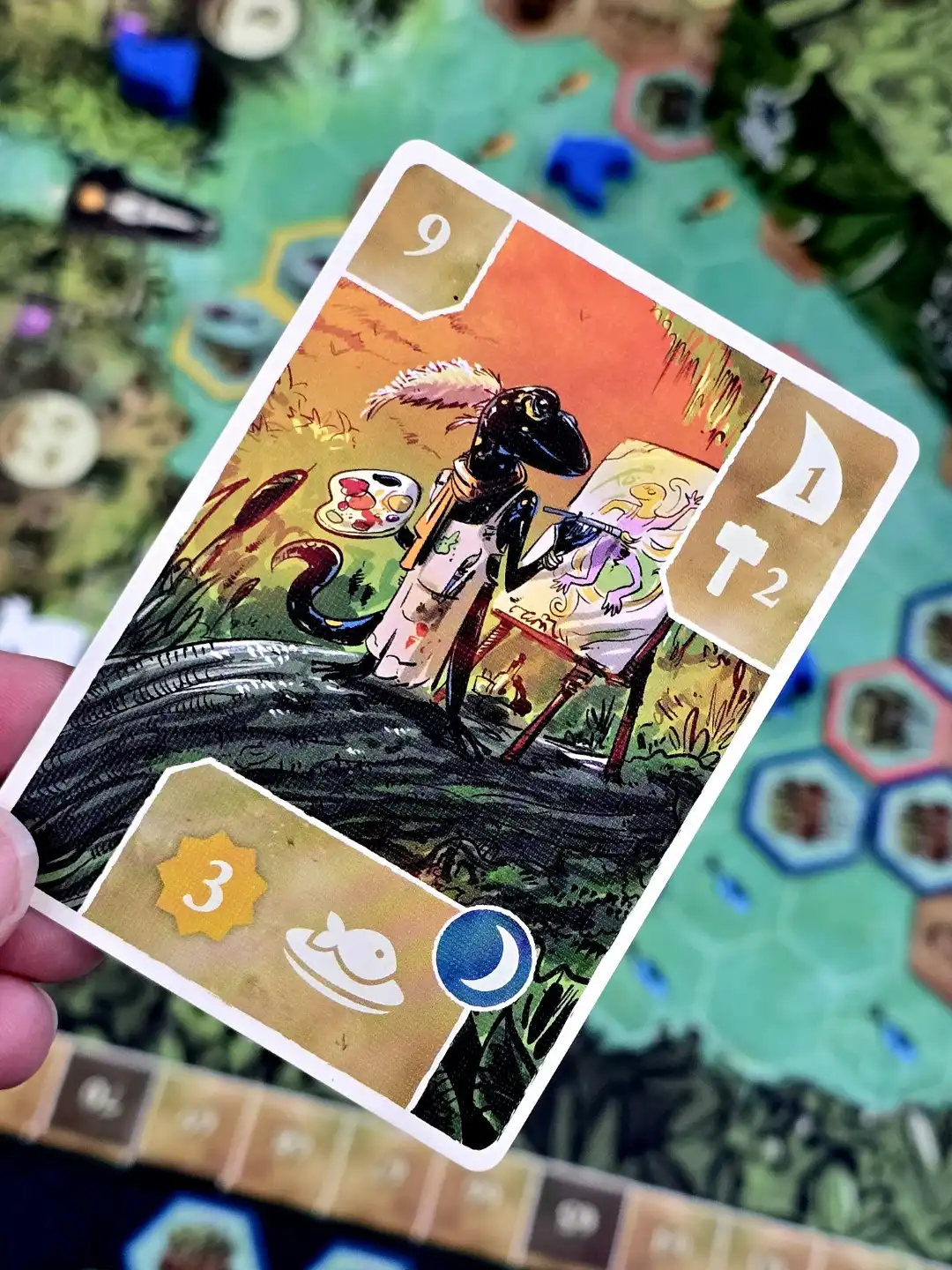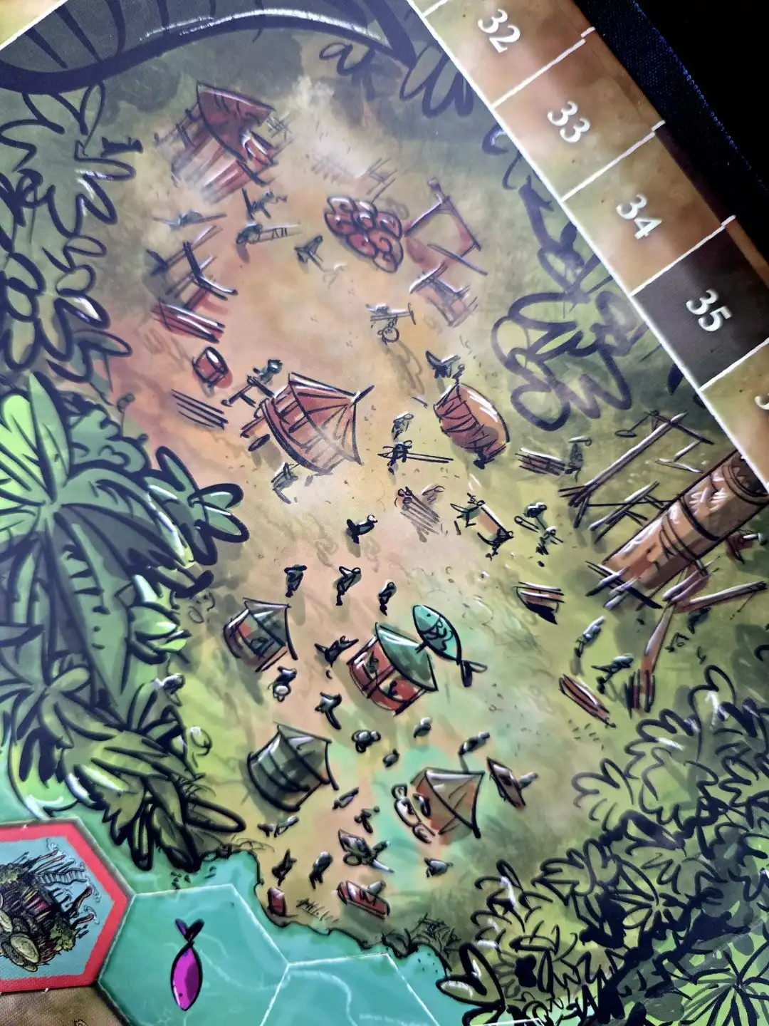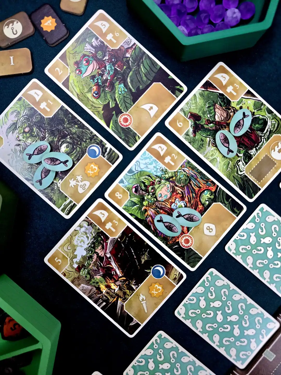 Gameplay is interactive. The islands grow and change shapes as you play, and each round different fish are “in season” which makes you move around. You’ll race for public objectives and you can also collect Temple tiles 🏛️ from the edges of the map, again encouraging ship movement. Time to time special Spirit tiles 🗿 are added to the islands, changing both the cost of building there and the score multiplier for settlements. You cannot let your opponents profit from those too much. ☝️