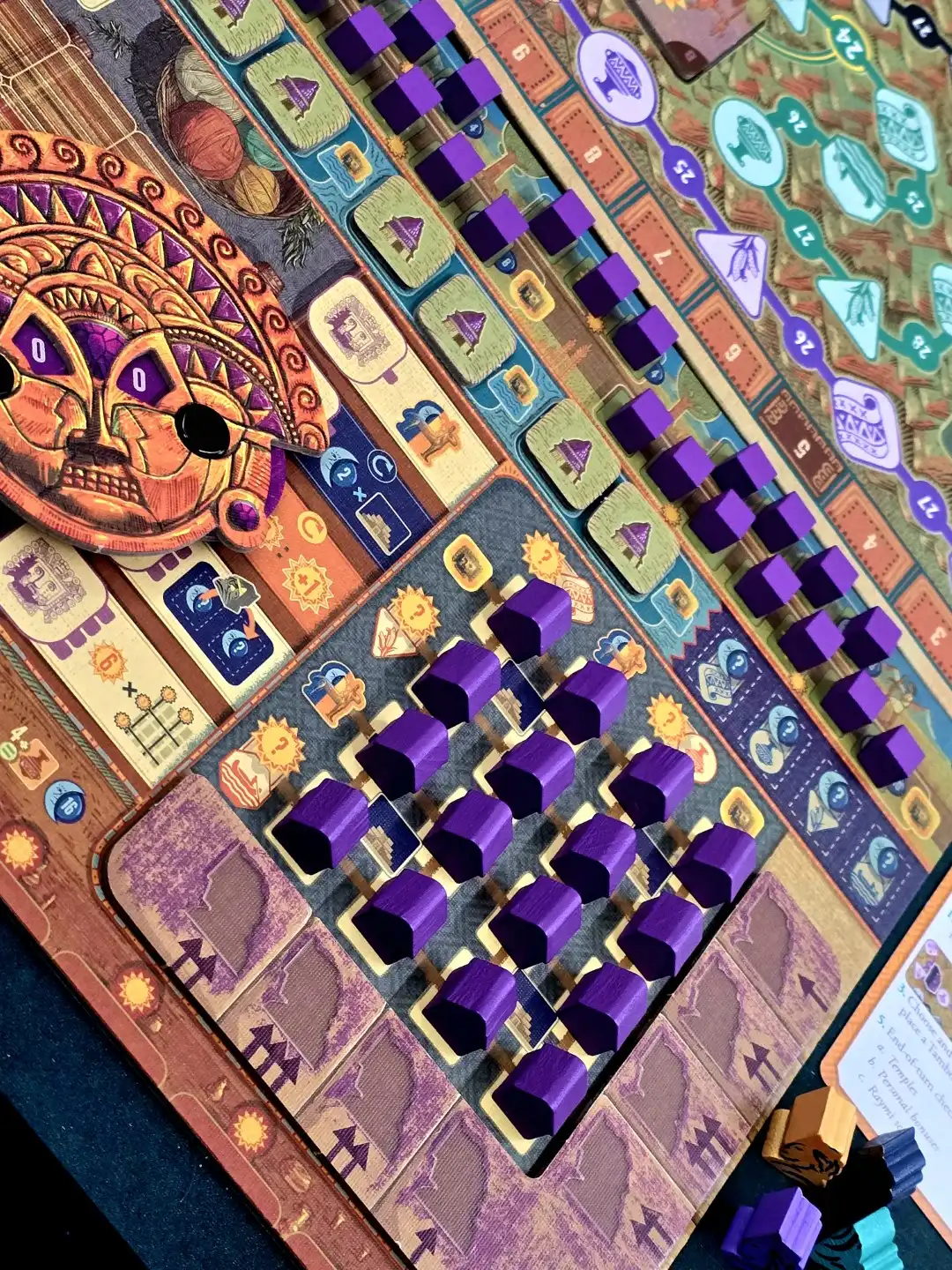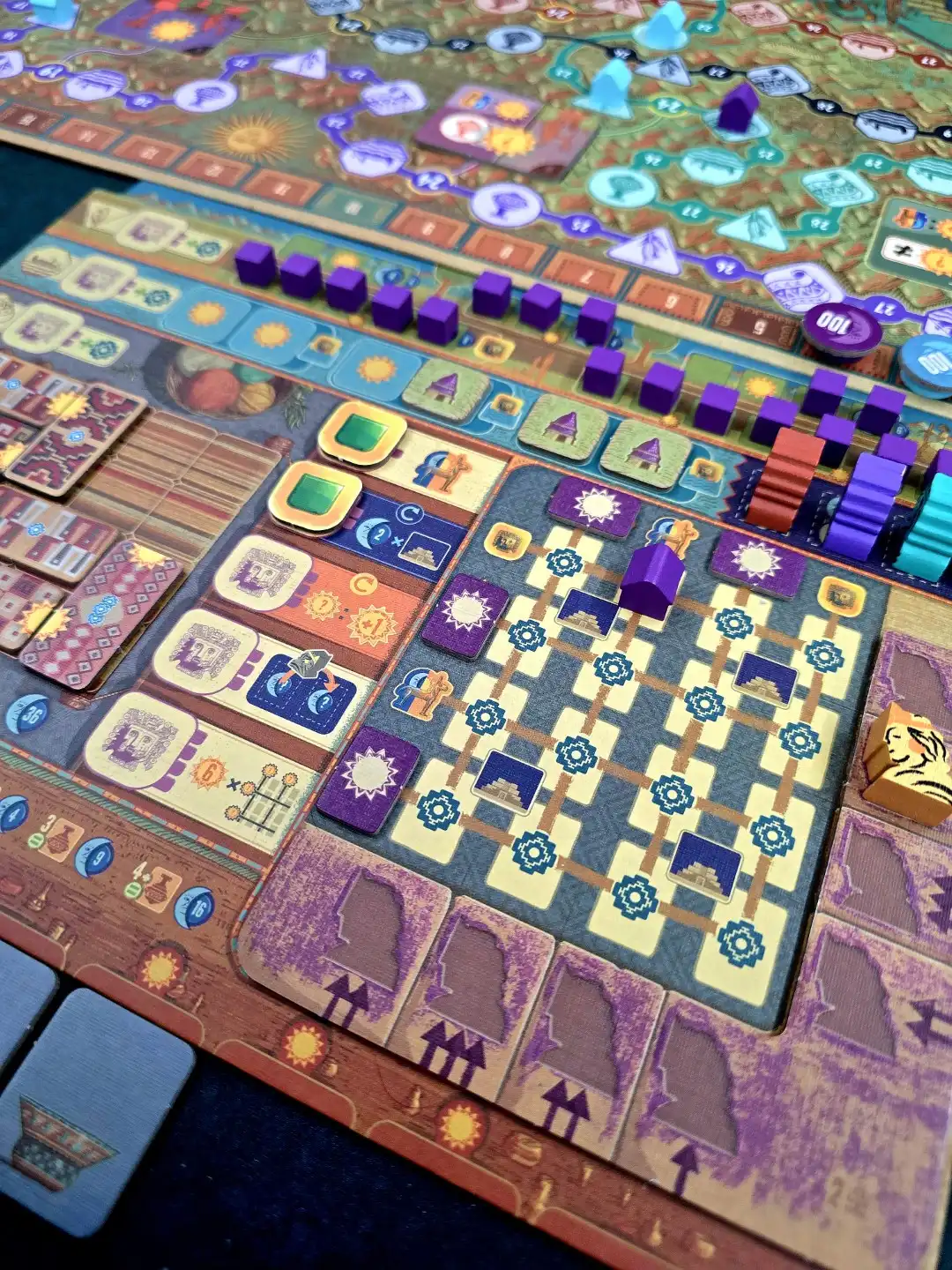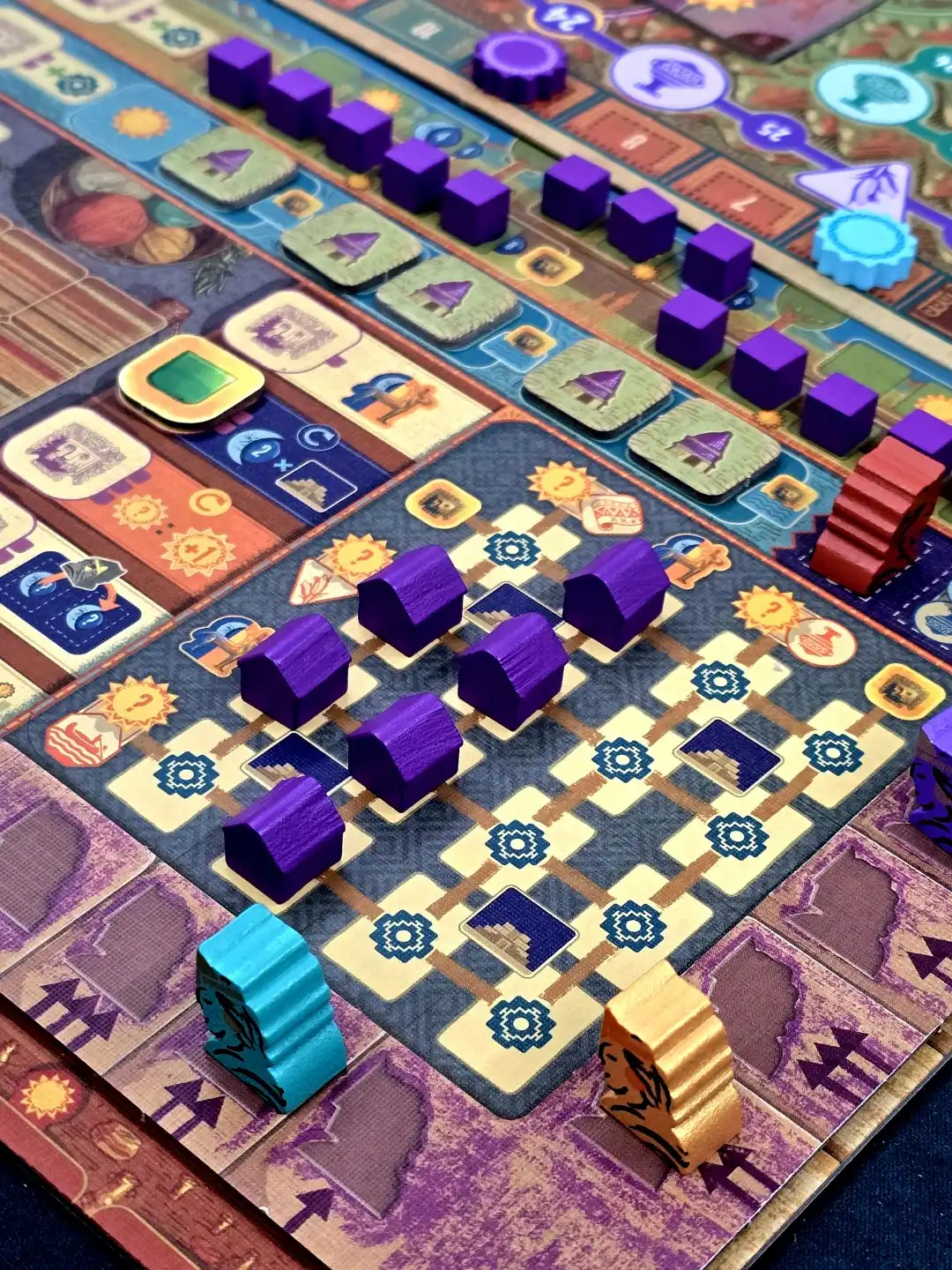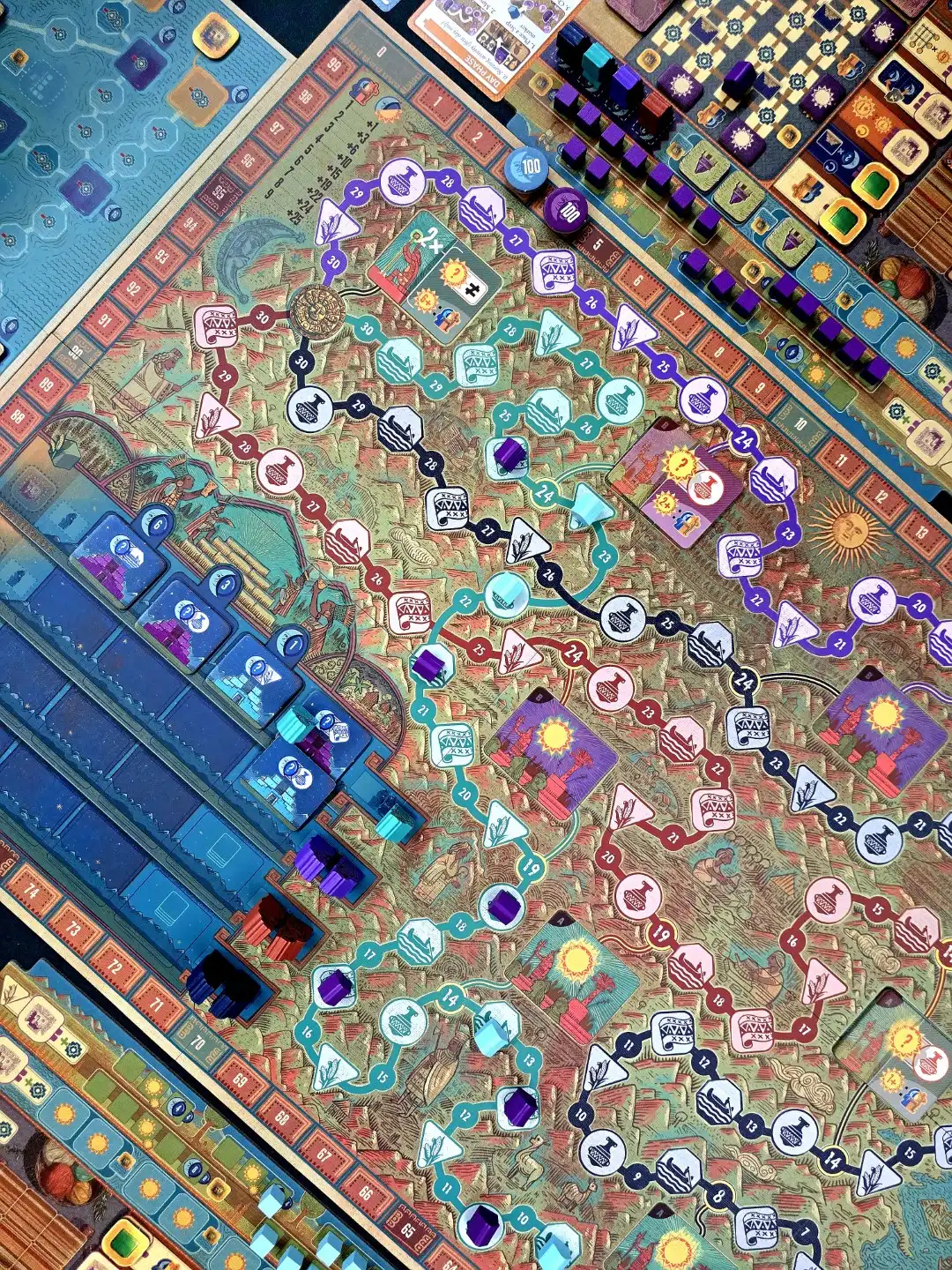 As players select actions (which are basically 4 mini-games each with a different core game mechanic), the Ayar meeples progress on the board, with players influencing their speed. Each round one of them retires, constraining future choices and actions. Ayars also trigger scorings when they reach certain spots. Scoring in general is very interesting as you gather both Sun ☀️ points and Moon 🌙 points, (which depend on how well you are doing in the 4 different mini-games) and only your lower marker will be taken into account at the end. 😮 And when certain Ayars retire, certain scoring conditions become unavailable, so you have to plan what actions to focus on while keeping an eye on your opponents - and pivot if necessary depending on which Ayar retires.