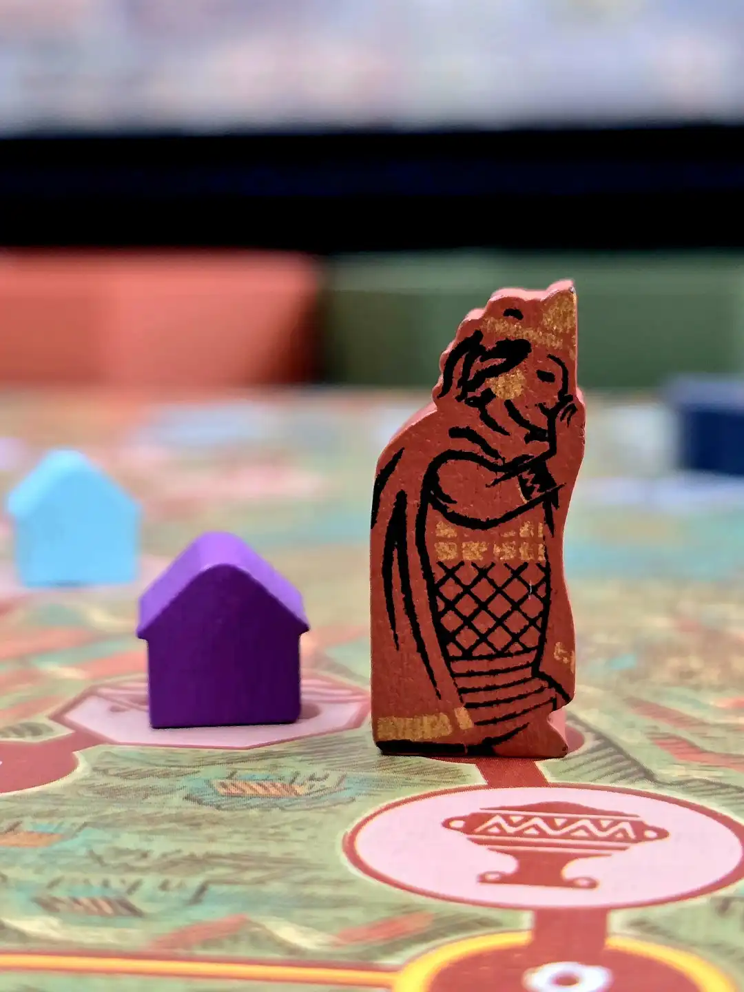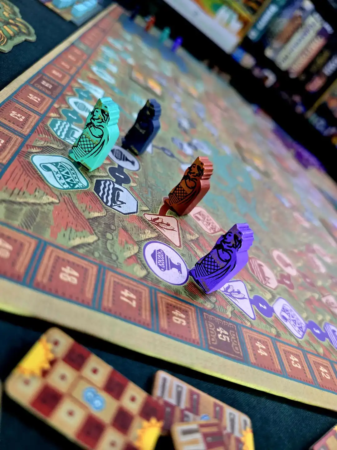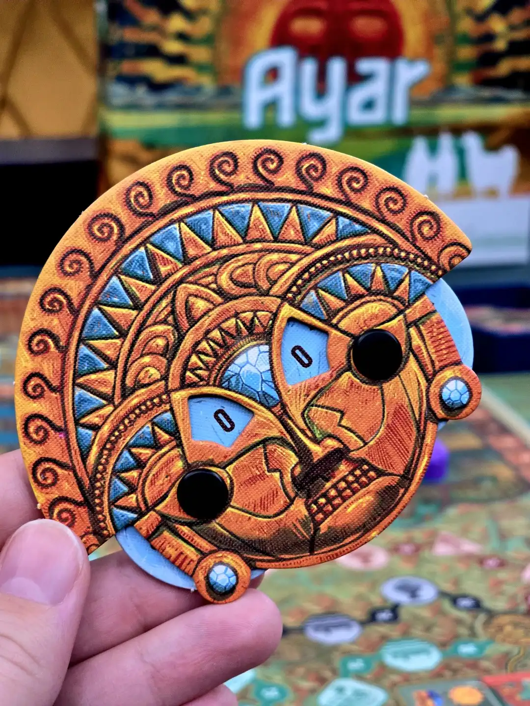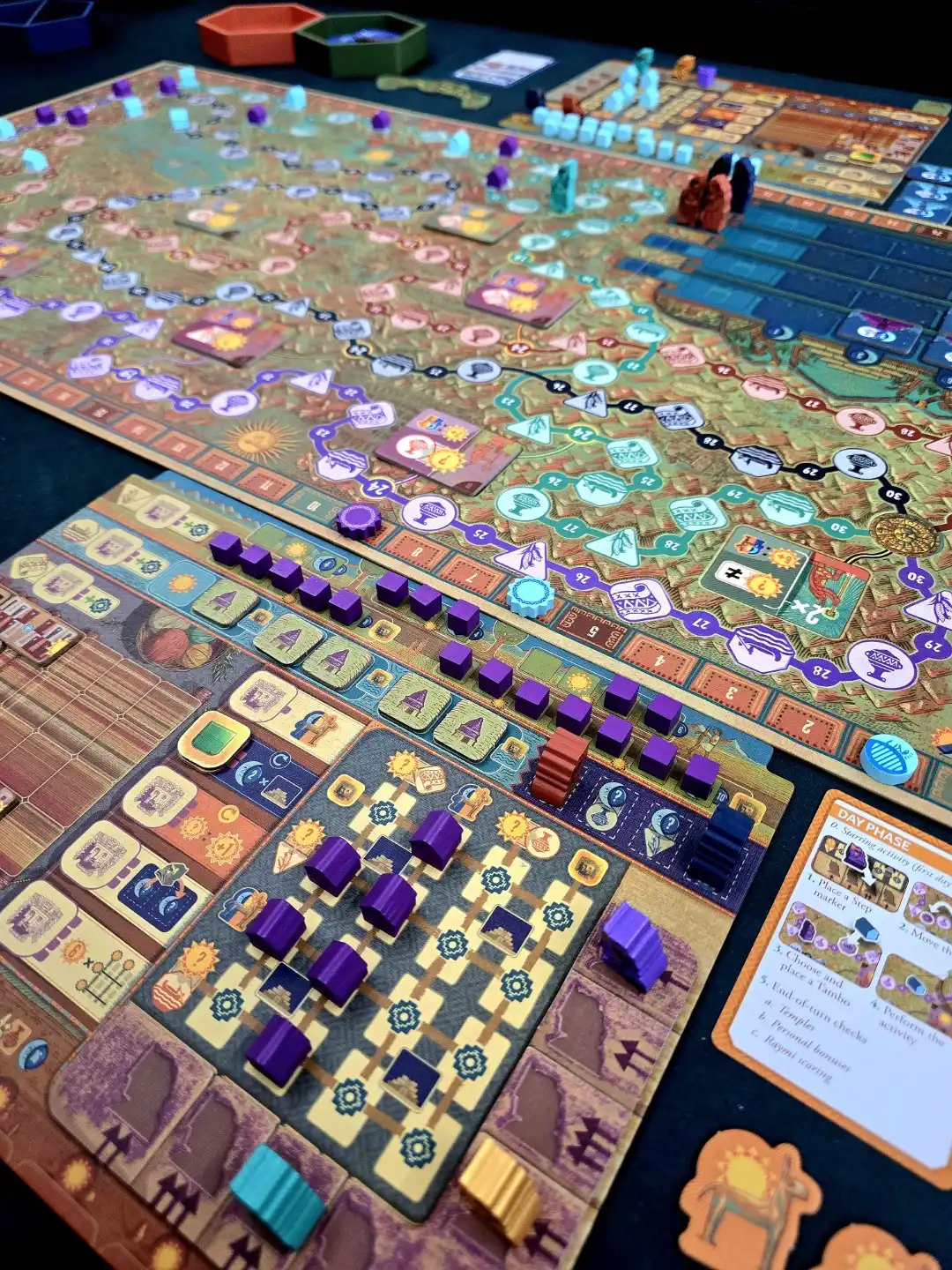 As players select actions (which are basically 4 mini-games each with a different core game mechanic), the Ayar meeples progress on the board, with players influencing their speed. Each round one of them retires, constraining future choices and actions. Ayars also trigger scorings when they reach certain spots. Scoring in general is very interesting as you gather both Sun ☀️ points and Moon 🌙 points, (which depend on how well you are doing in the 4 different mini-games) and only your lower marker will be taken into account at the end. 😮 And when certain Ayars retire, certain scoring conditions become unavailable, so you have to plan what actions to focus on while keeping an eye on your opponents - and pivot if necessary depending on which Ayar retires.